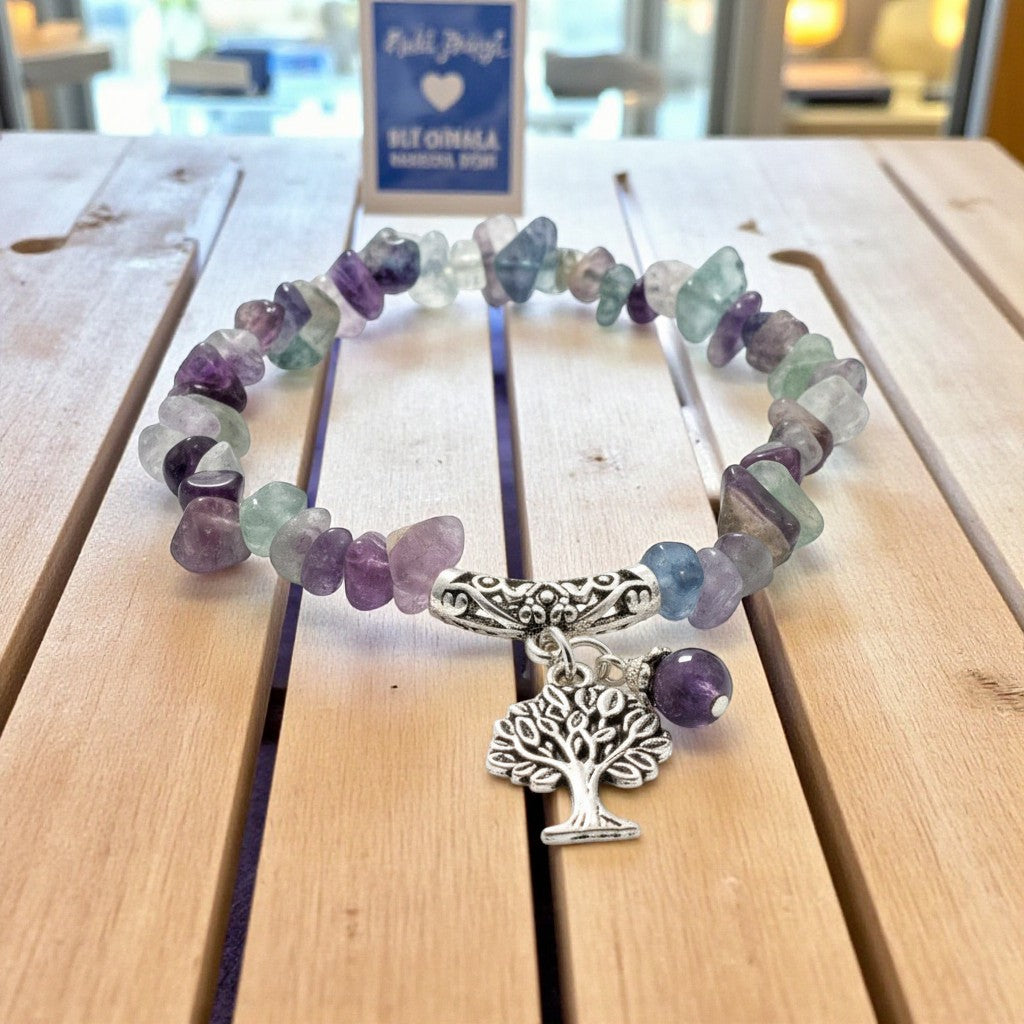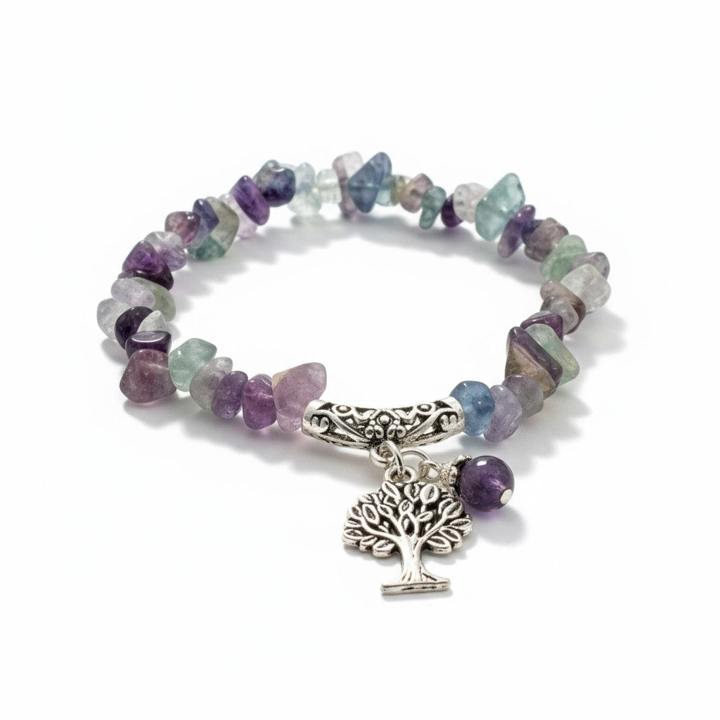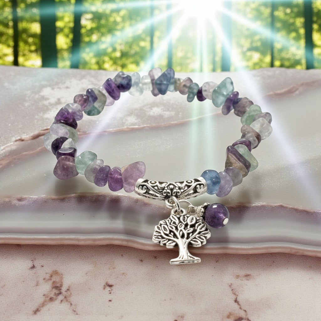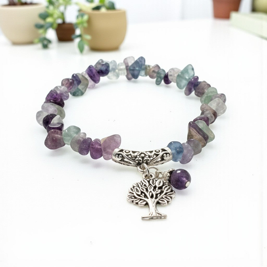 Chipped Fluorite Bracelet with Tree of Life Charm To Harmonize And Balance Your Thoughts and Feelings.