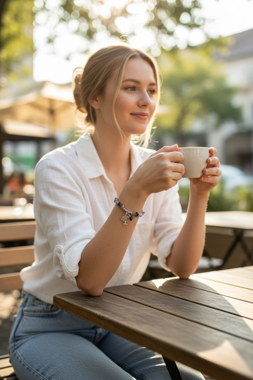 This bracelet combines natural fluorite chips with a Tree of Life charm, designed to support mental clarity and emotional balance.... Read more