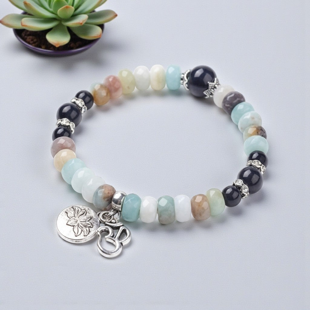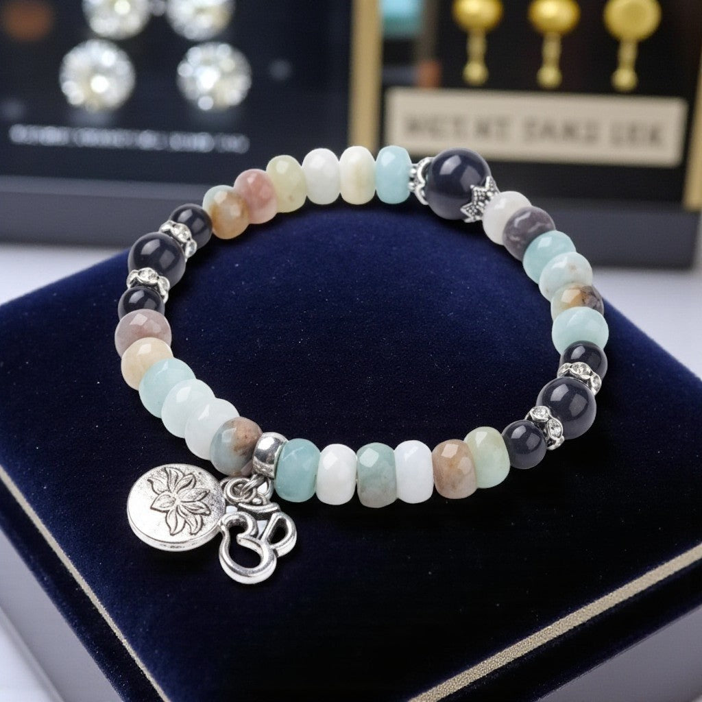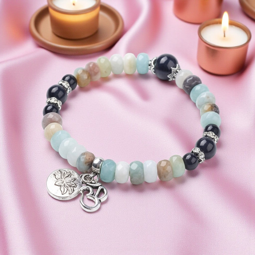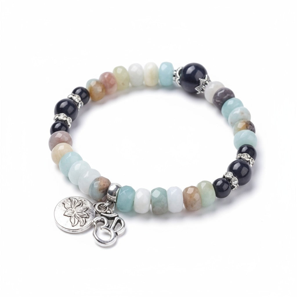 Natural Amazonite and Obsidian Stretch Bracelet with Lotus and Om Symbol Charm