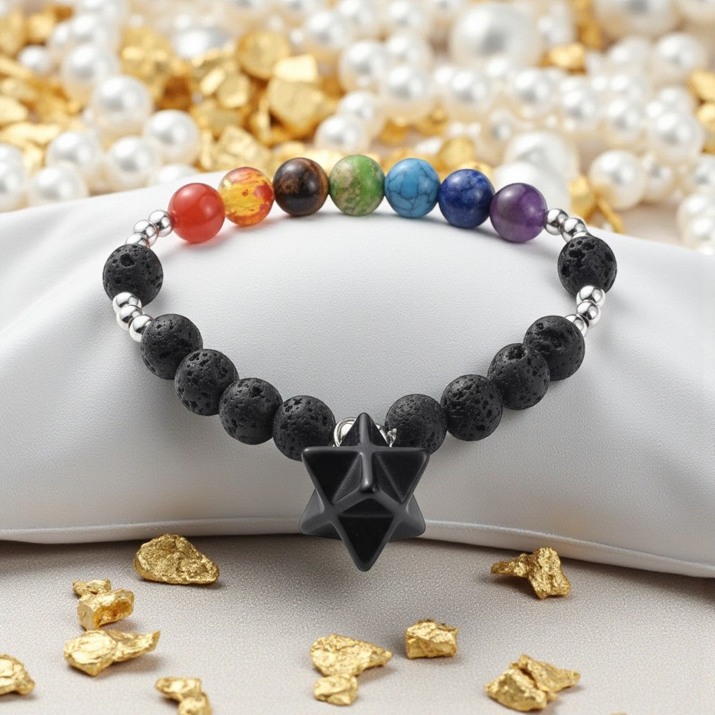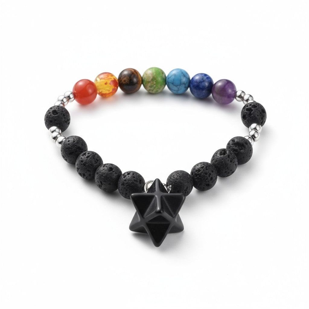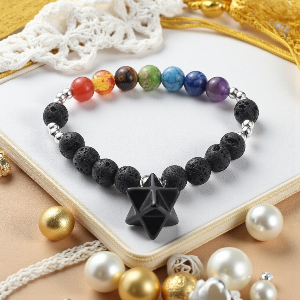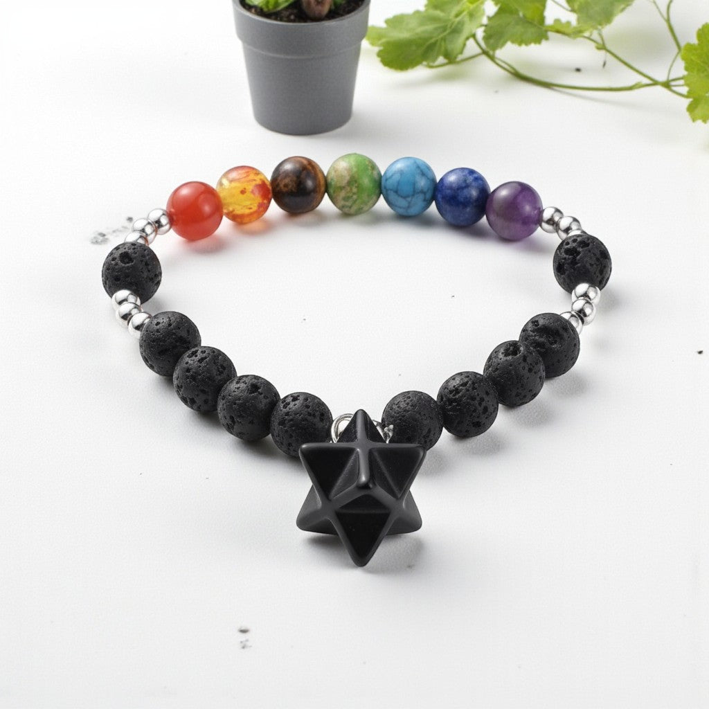 A natural lava stone and obsidian chakra bracelet spiritually promotes grounding, protection and emotional stability by combining the Earthy energy of lava stone, the negative energy repelling properties of obsidian, and the balanced energy of the seven chakras. The lava stone acts as a grounding element and absorbs negative emotions, while black obsidian shields against harmful energies and promotes inner strength. Together, they work with the chakra beads to align your energy centers, foster spiritual growth, and promote overall well-being.